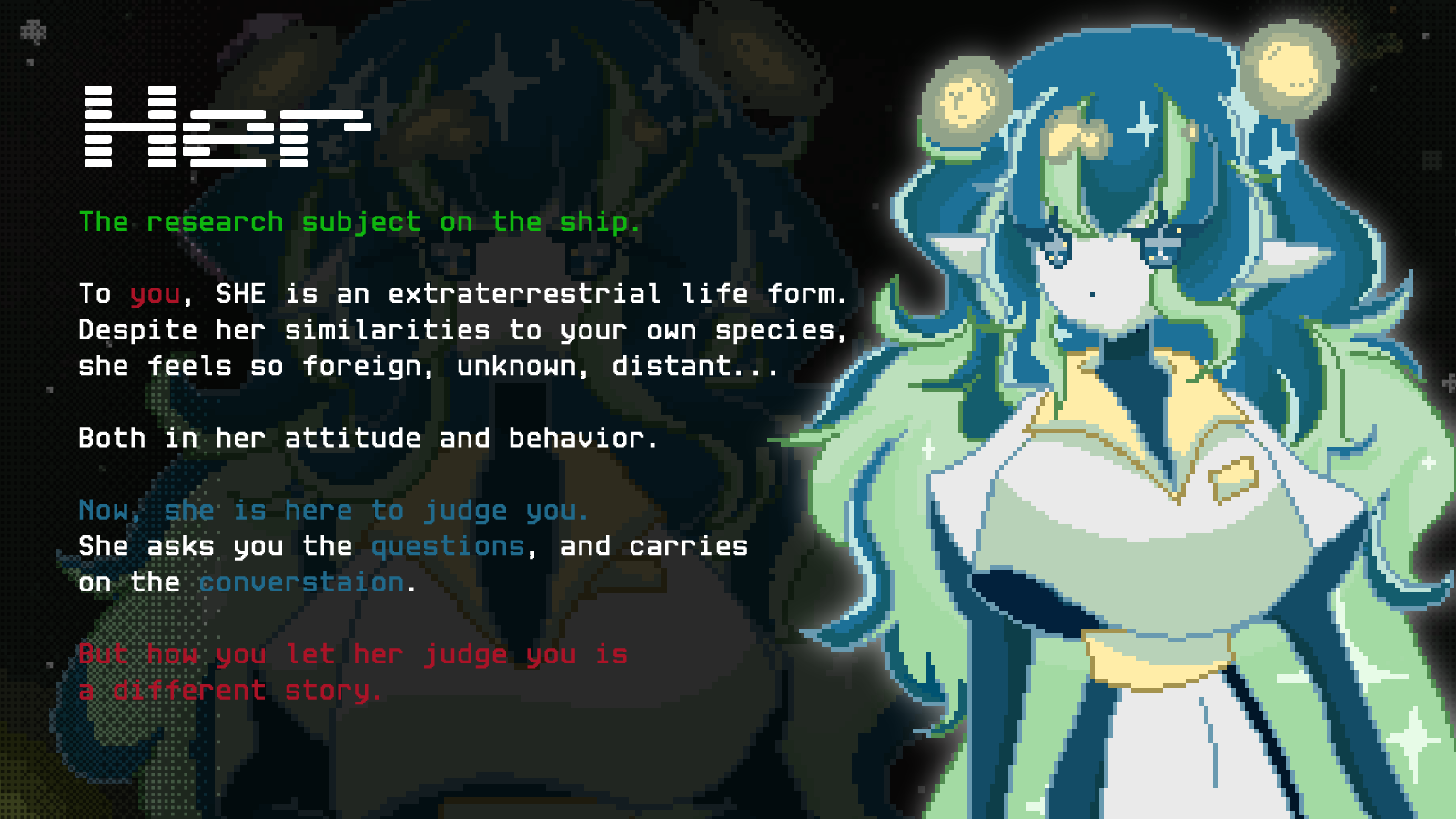 ◆ A simple visual novel game with one main gimic; the main gameplay is simply listening to a character talk and choosing what to do - ‘answer them’ or ‘stay silent’.